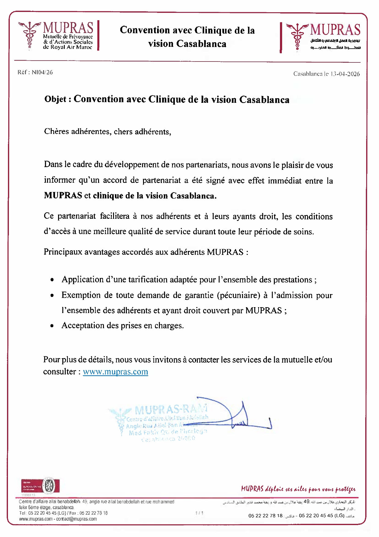 Articles Convention avec la clinique de la vision 14 avril 2026 Publié par : MUPRAS 14 Avr Télécharger la note